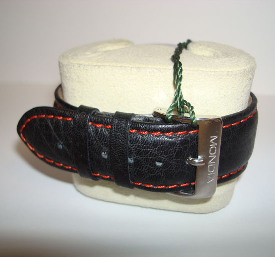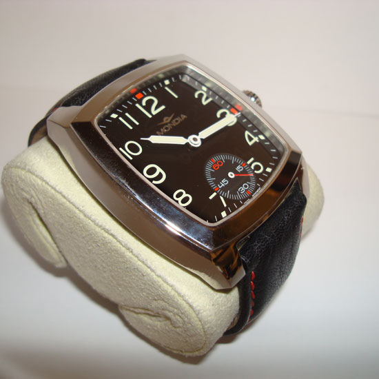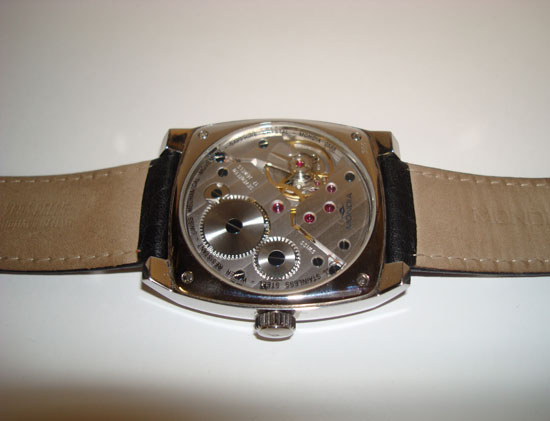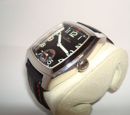 Description :steel, black dial, sapphire crystal, automatic movement, small seconds, luminescence in dial and handles, screwed crown, diameter 43 mm, waterproof 30 meters, transparent back cover, size 16 ½, black leather strap, steel buckle closure.