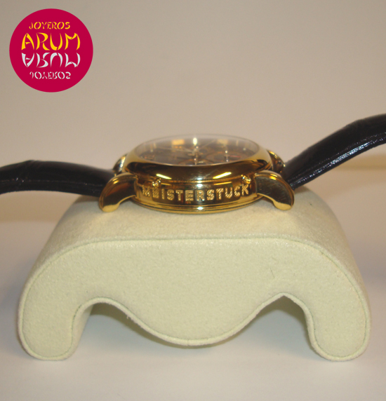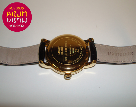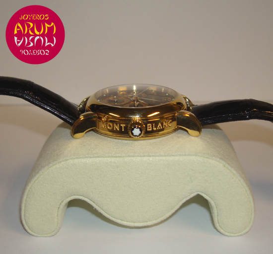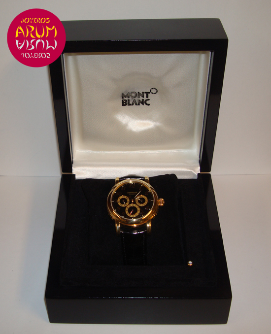 Description :yellow gold, black dial with arabic numbers, sapphire crystal, automatic movement, three indicators on the dial, date at three, day of the week at nine, second time zone at six, handles and luminescent dial indicators, crown with the Montblanc logo, diameter 38 mm, 30 meters waterproof, leather strap, buckle closure.