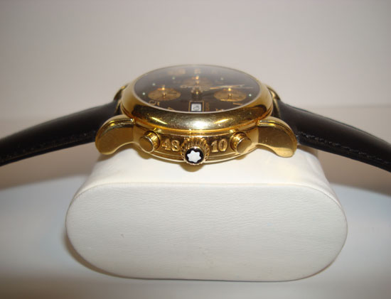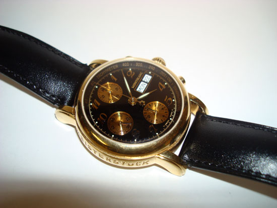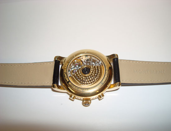 Description :yellow gold, sapphire crystal, automatic movement, 3 indicators on the dial, seconds, minutes and hours, chronograph, day of week and date, luminescent handles, crown with logo of Montblanc and two buttons, diameter 37 mm, water resistant 30 meters, transparent back cover, black leather strap, gold buckle closure.