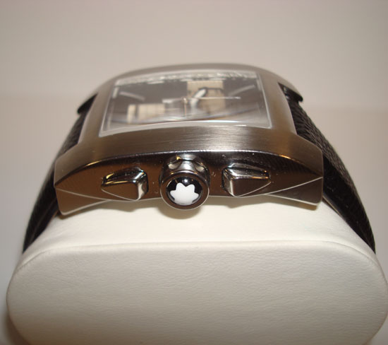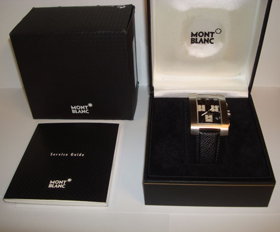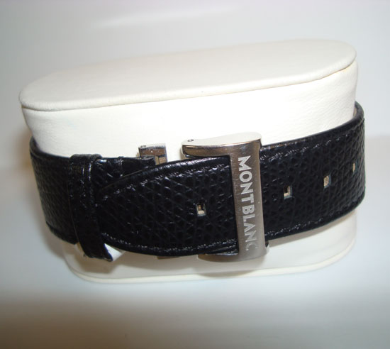 Description :steel, sapphire crystal, quartz movement, black dial with 3 indicators, chronograph, date, crown with logo of Montblanc, two buttons, 33 mm diameter, luminescent handles, waterproof 30 meters, black leather strap, folding clasp.