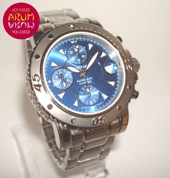 Description :steel, blue dial, rotating bezel, sapphire crystal, automatic movement, chronograph, three indicators on the dial, minutes, hours, small seconds at nine, date at three with magnifier, screw crown decorated with the logo of Montblanc and two buttons, diameter 42 mm, waterproof 200 meters, steel strap, hidden folding clasp, year 2011.