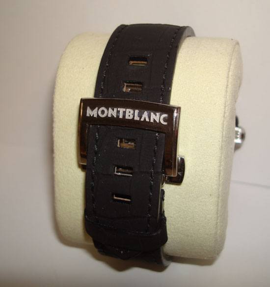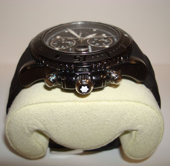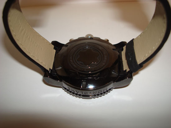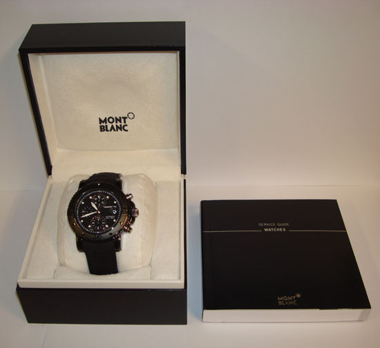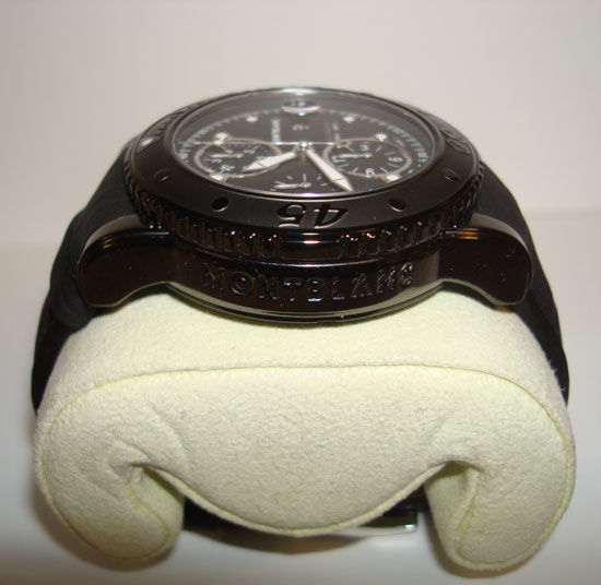 Description :black steel, black dial, sapphire crystal, automatic movement, unidirectional rotating bezel, chronograph, three indicators on the dial, seconds, minutes, hours, date at three o’clock, date magnifier, handles and luminescent dial, waterproof 200 meters, screw crown and two buttons, diameter 44 mm, black leather strap, steel folding clasp.