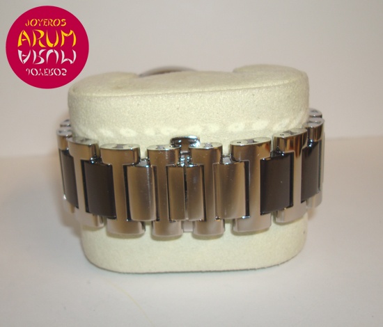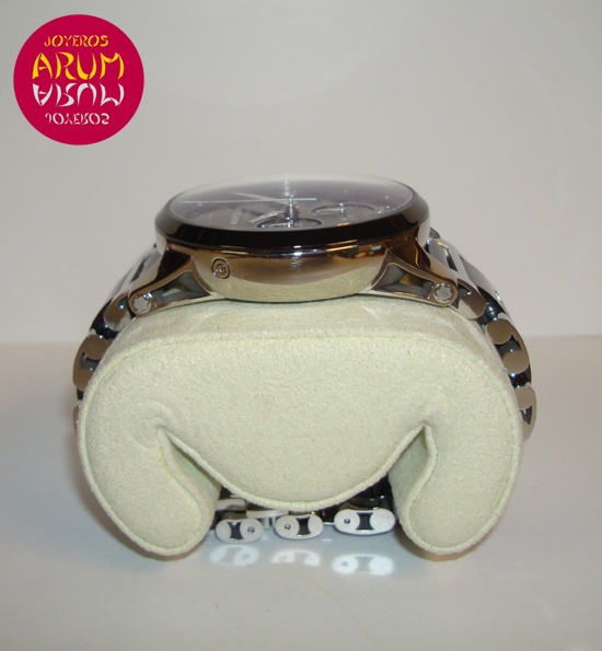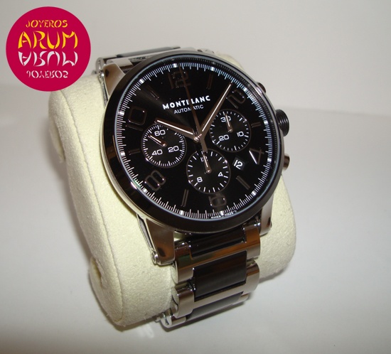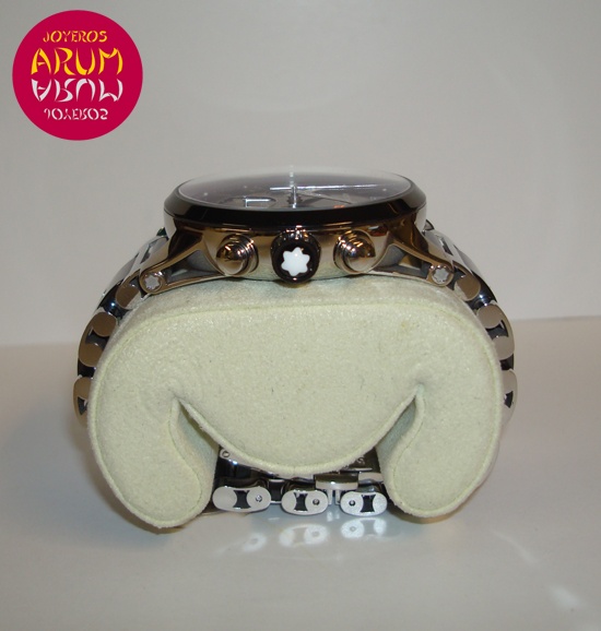 Description :steel, black dial, sapphire crystal, automatic movement, chronograph, three indicators on the dial, seconds, minutes, hours, date between four and five, handles with luminescent indicators, crown with Montblanc brand logo and two buttons at right, diameter 43 mm, waterproof 30 meters, transparent back, strap in steel and ceramic, hidden folding clasp, year 2010.