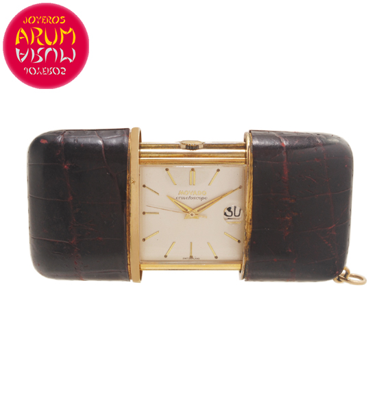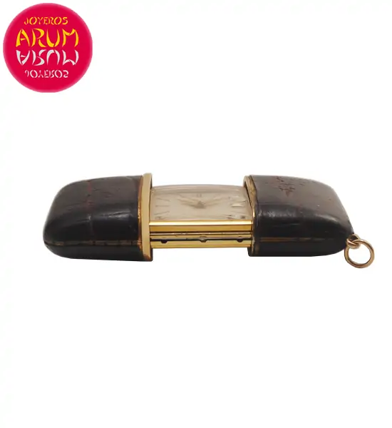 Other specifications :travel, pocket and table clock made in the 50´s by the prestigious Swiss firm Movado founded in 1881, steel gold plated and crocodile skin, automatic mechanism that recharges when opening and closing the sliding box, date with magnifying glass, second hand central.