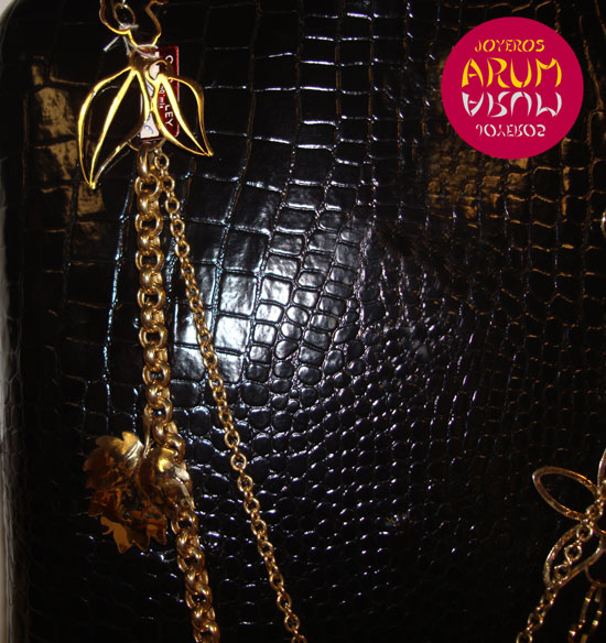 Product: Tous double necklace of yellow gold with various decorative elements, a flower with a pearl in the center, a dragonfly, tree leaves, bears original of Tous. Approximate length of 72 cm, weight 106 grs.