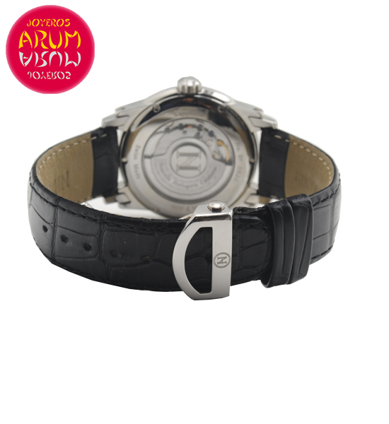 Other specifications :smooth bezel, guillose dial, central seconds, date at twelve, second time zone at three, power reserve indicator,day of the week at nine, transparent caseback.