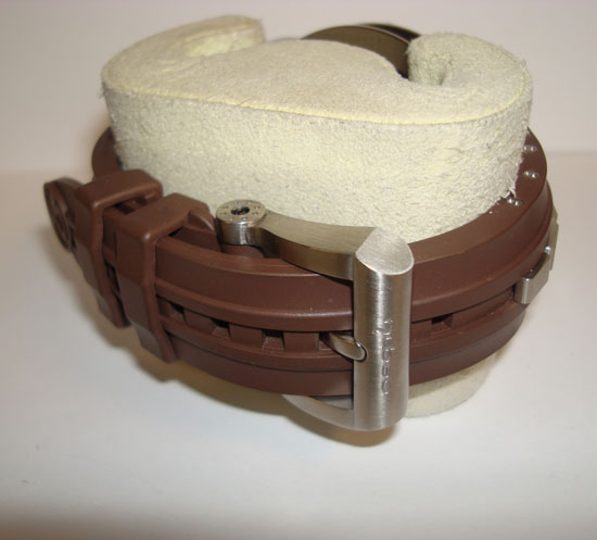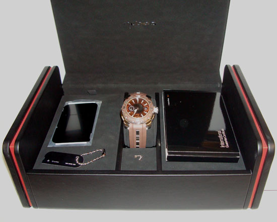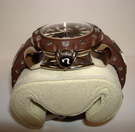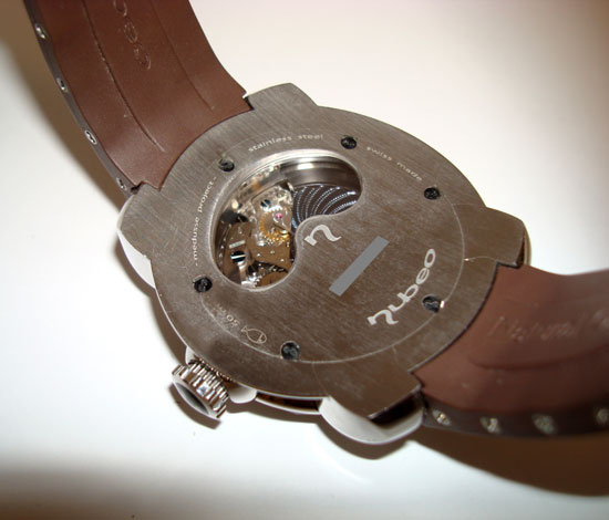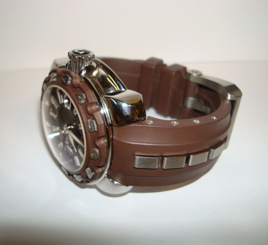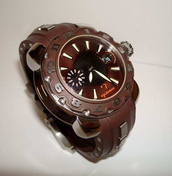 Description :steel, protective rubber bezel with numeric scale, anti-glare sapphire crystal, automatic movement, small seconds at nine, date at three, handles and luminescent dial, screw crown, diameter 50 mm, transparent back case, waterproof 50 meters, brown rubber strap, buckle closure.