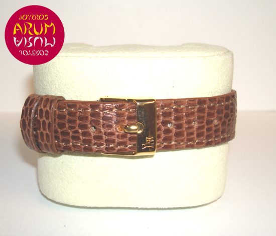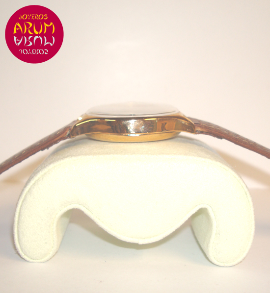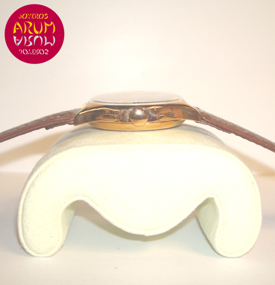 Description :pink gold, beige dial, plastic crystal, chronograph, two indicators on the dial, minute indicator at three, small seconds at nine, antimagnetic, 17 jewels, crowns and two buttons at right, 35 mm diameter, brown leather strap, buckle closure, 50´s.
