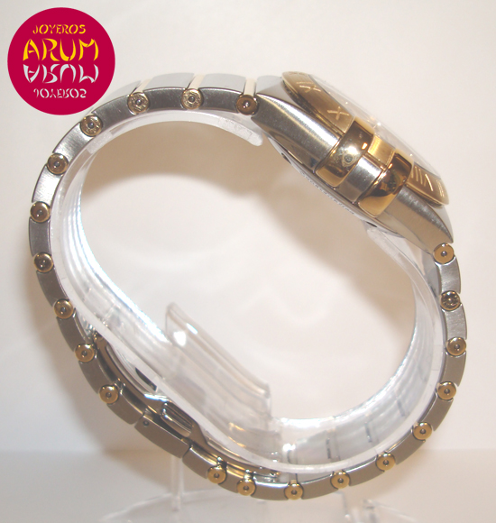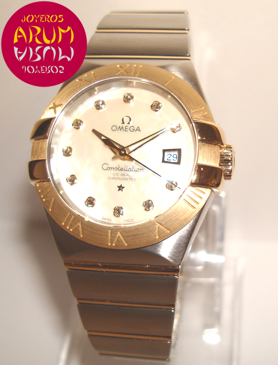 Description :ladies watch, steel and yellow gold, mother of pearl dial with diamonds, bezel with roman numerals, sapphire crystal, automatic movement, co-axial escapement, center seconds, luminescent handles, date at three, screw crown, diameter 32 mm, waterproof 100 meters, steel and gold strap, hidden folding clasp, year 2010.