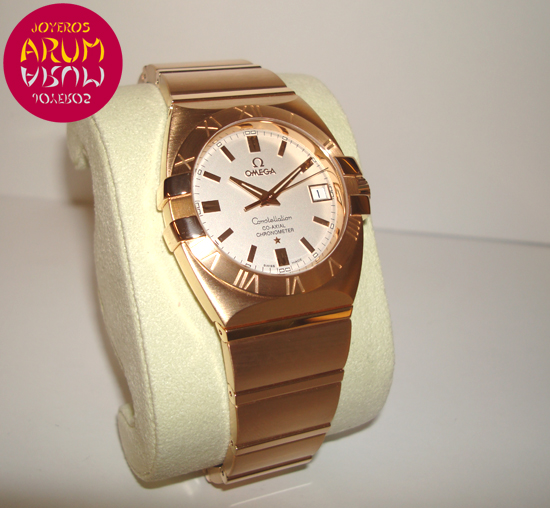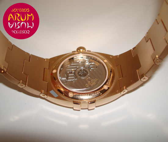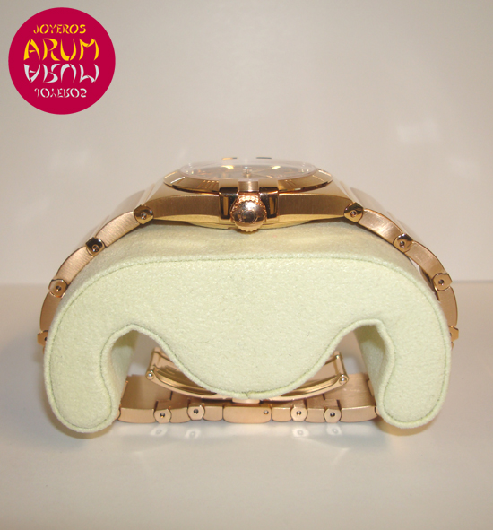 Description :pink gold, white dial, fixed bezel with roman numerals, sapphire crystal, automatic movement, caliber 2500, co-axial, power reserve 44 hours, center seconds, luminescent indicator handles, screw crown, date at three, transparent caseback, diameter 35 mm, waterproof 100 meters, rose gold strap, hidden folding clasp in rose gold.