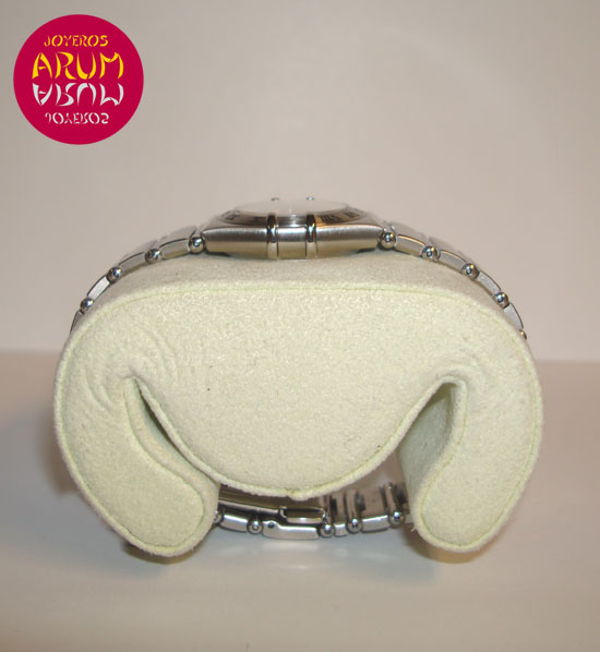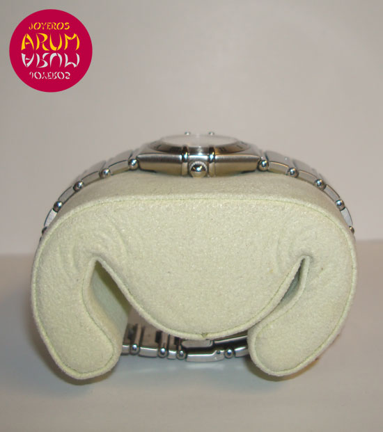 Description :lady’s watch, steel, white dial, bezel with roman numbers, sapphire crystal, quartz movement, luminous indicators handles, screw crown, diameter 22 mm, waterproof 30 meters, steel strap, hidden folding clasp.