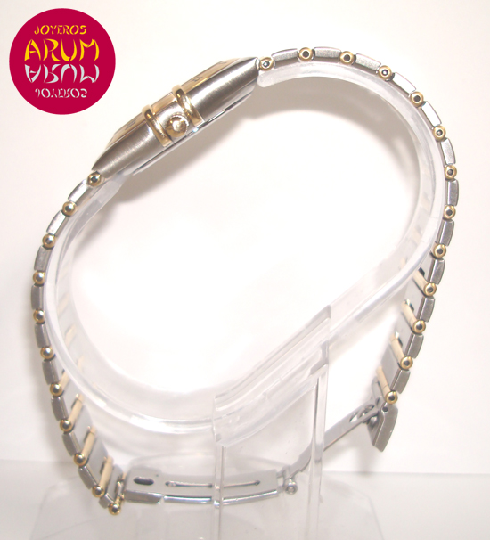 Description :ladies watch, steel and yellow gold, bezel with roman numbers, white dial, sapphire crystal, quartz movement, central second, date at three, luminescent handles, screw crown, diameter 27.5 mm, waterproof 30 meters, steel and yellow gold strap, hidden folding clasp, year 2007.