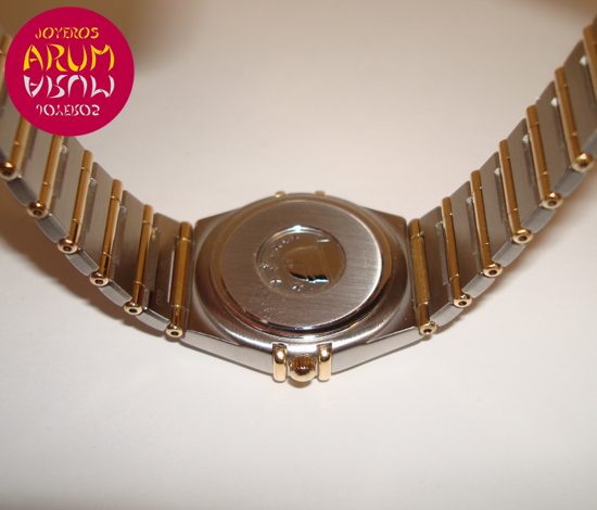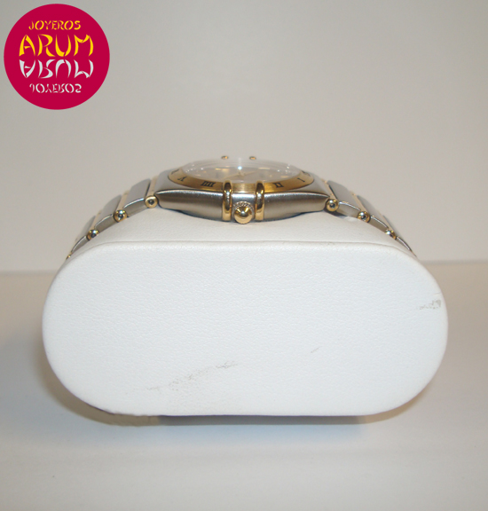 Description :lady’s watch, steel and yellow gold, white dial, fixed bezel with roman numbers, sapphire crystal, quartz movement, center seconds, luminescent handles, date at three, diameter 27 mm, steel and yellow gold strap, folding clasp hidden, year 2004.