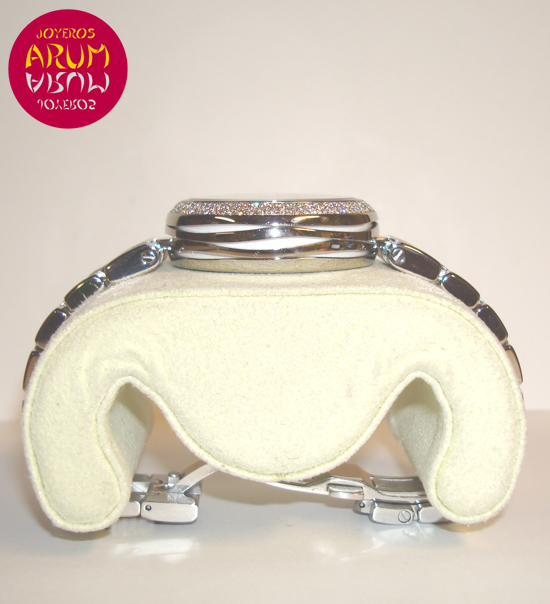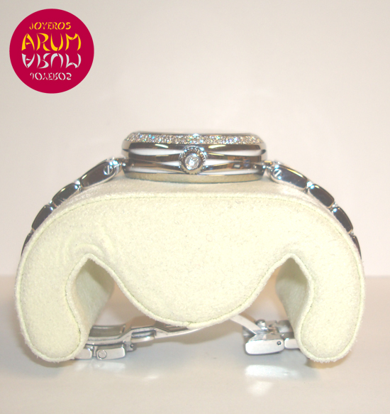 Description :steel, mother of pearl dial decorated with 11 brilliant, diamond with bezel, sapphire crystal, automatic movement, co-axial escapment, center seconds, date at three, handles with luminescent indicators, right crown, transparent caseback, diameter 34 mm, waterproof 100 meters, steel strap, hidden folding clasp, year 2011.