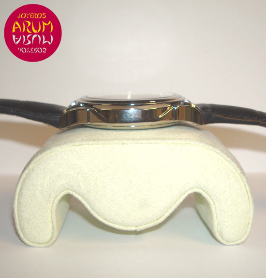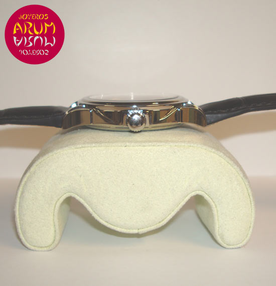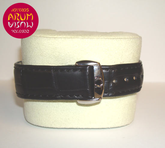 Description :steel, gray dial, sapphire crystal, automatic movement, co-axial escapement, power reserve indicator at six, small seconds at nine, date at three, luminescent indicators in hands and dial, screw crown at right, diameter 38.5 mm, waterproof 30 meters, black leather strap, folding clasp.