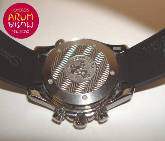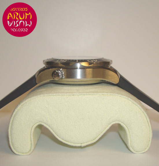 Description :steel, black dial, rotating bezel, sapphire crystal, automatic movement, chronograph, three indicators on the dial, seconds, minutes, hours, date at six, screw crown and two buttons to the right, assistant crown at ten, handles and luminescent dial, diameter 41 mm, water resistant 300 meters, rubber strap, buckle closure, year 2003.
