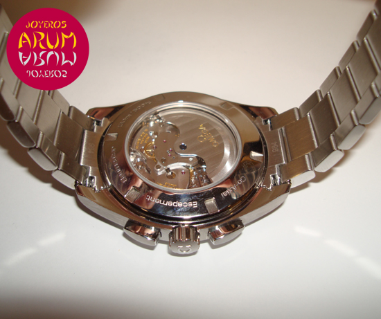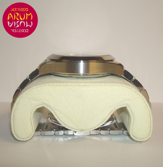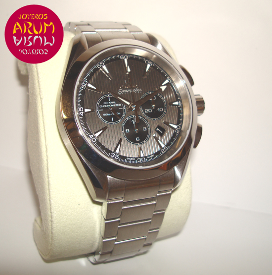 Description :steel, anthracite dial, smooth bezel, sapphire crystal, automatic movement, co-axial escape, chronograph, three indicators on the dial, seconds, minutes, hours, date between four and five, handles and luminescent dial, transparent caseback, waterproof to 150 meters, diameter 44 mm, steel strap, steel folding clasp.