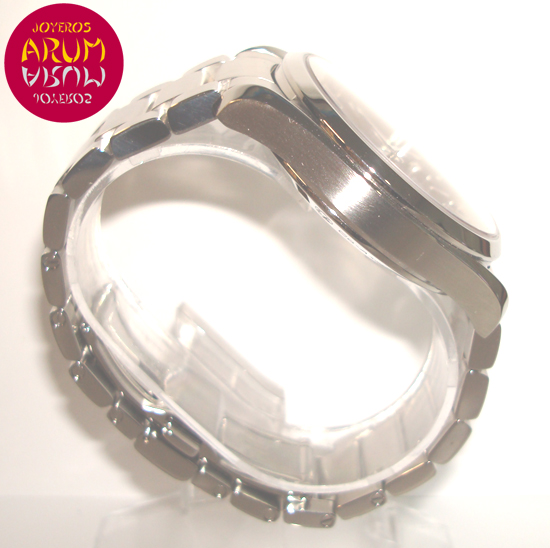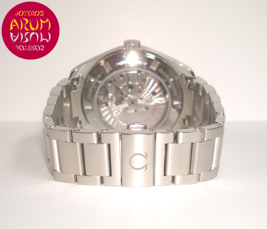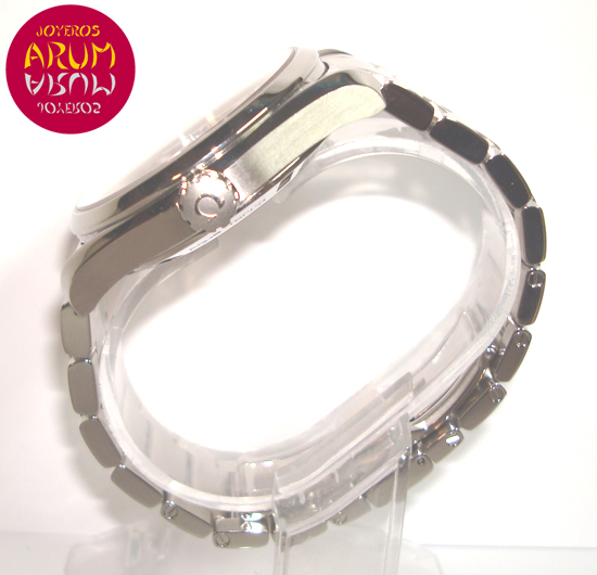 Description :steel, grey dial, smooth bezel, sapphire crystal, automatic movement, co-axial escapement, center seconds, date at three, luminescent handles and index, screw crown, transparent back, diameter 41 mm, waterproof 150 meters, steel strap, folding clasp.