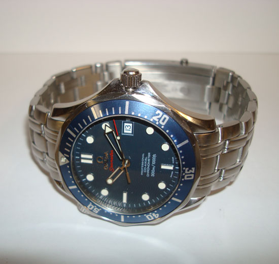 Description :steel, blue dial, center seconds, rotating bezel with luminescent indicator, co-axial, luminiscence handles and dial, date at 3, waterproof 300 meters, two crowns, automatic movement, 41mm diameter (Large size), steel belt, steel folding clasp.