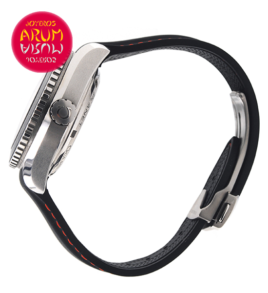 Other specifications :calibre Omega 8605, rotating ceramic bezel in both directions, GMT (second time zone with central handle), date at three, central seconds, screw crowns, auxiliary crown at ten, luminiscence marks, helium valve, transparent caseback, year 2013. Includes second steel strap.