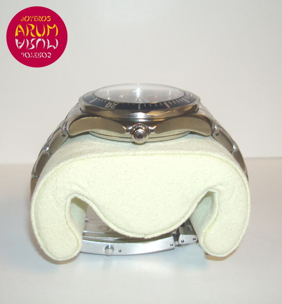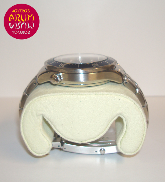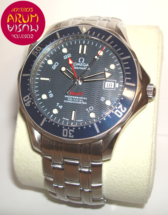 Description :steel, blue dial, unidirectional rotating bezel, sapphire crystal, automatic movement, co-axial escape, center seconds, luminescent handles and dial, date at three, GMT function (second time zone indicated by auxiliary handle), waterproof 300 meters, 41 mm diameter, crown assist at ten, transparent case back, steel strap, steel folding clasp, year 2005.