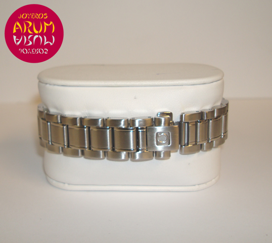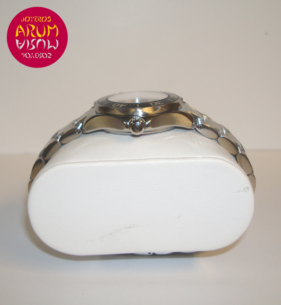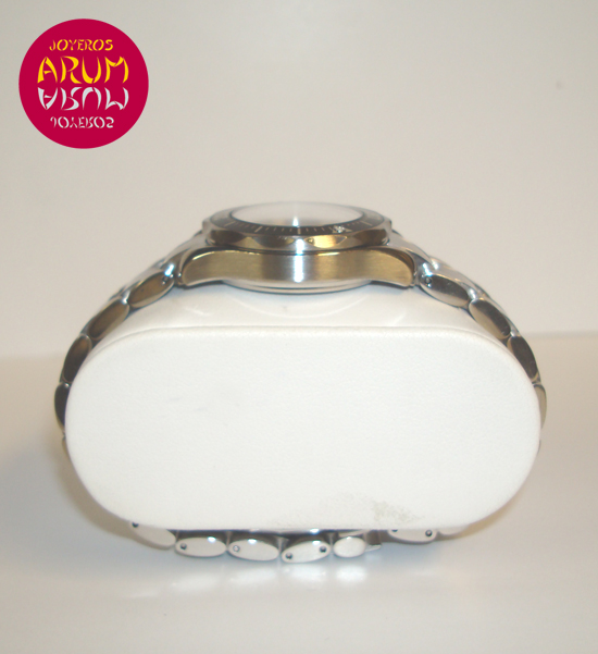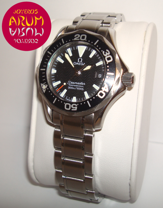 Description :lady’s watch, steel, black dial, unidirectional rotating bezel, sapphire crystal, quartz movement, central second, date at three, handles and luminescent dial, water resistant 300 meters, screw crown, diameter 28 mm, steel strap, hidden folding clasp, year 2005.