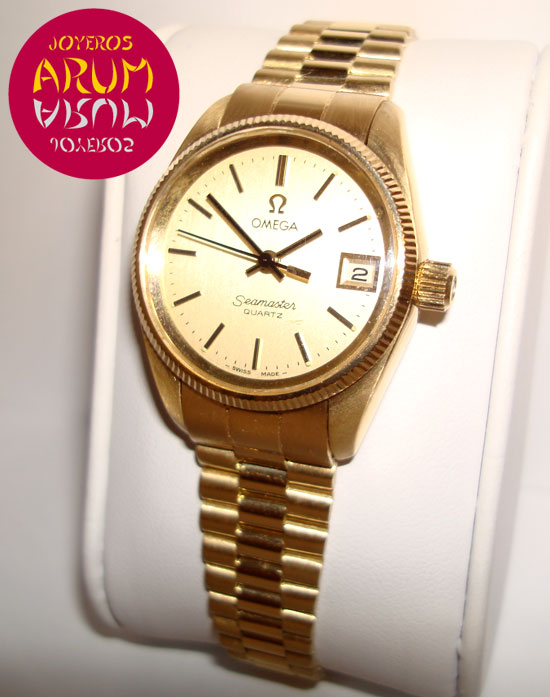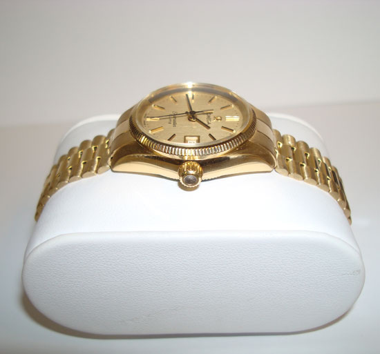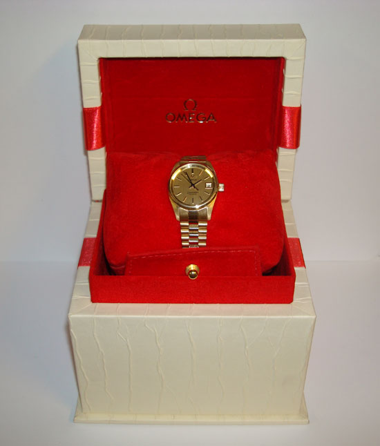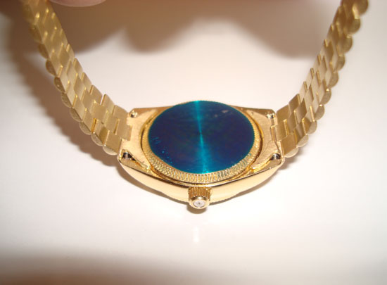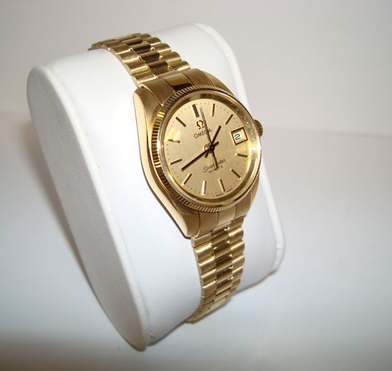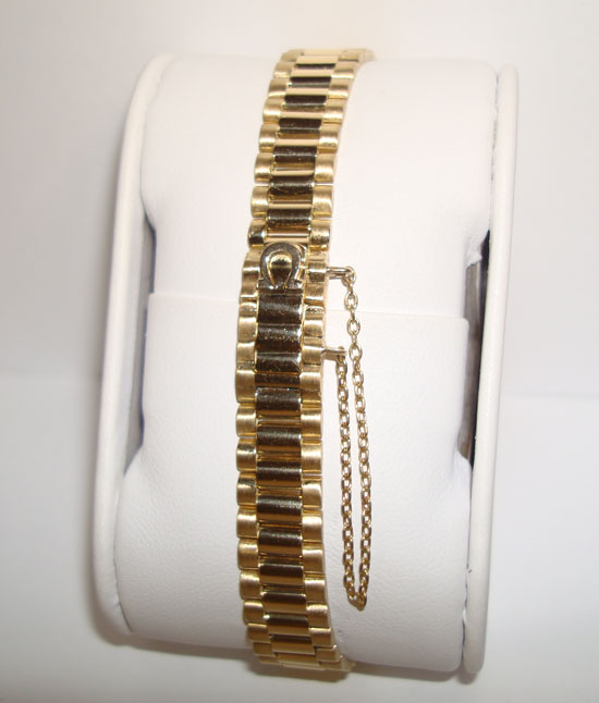 Description :lady’s watch, yellow gold, sapphire crystal, quartz movement, central second, date at three o’clock, screw crown, diameter 24 mm, yellow gold strap, folding clasp.