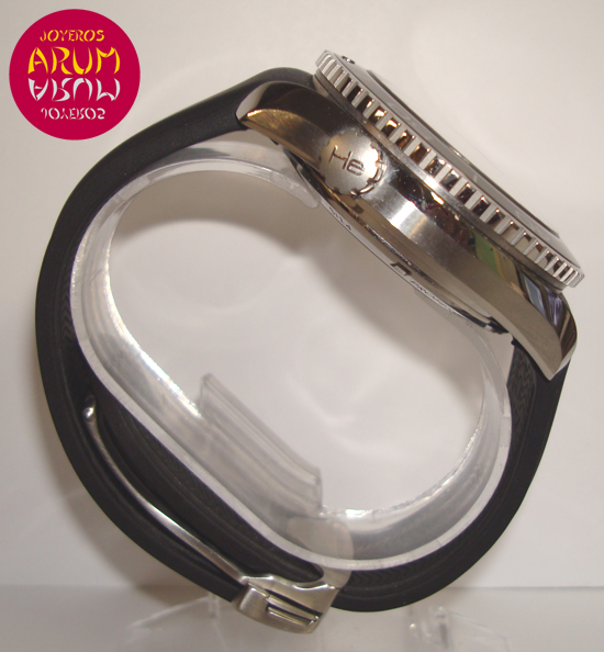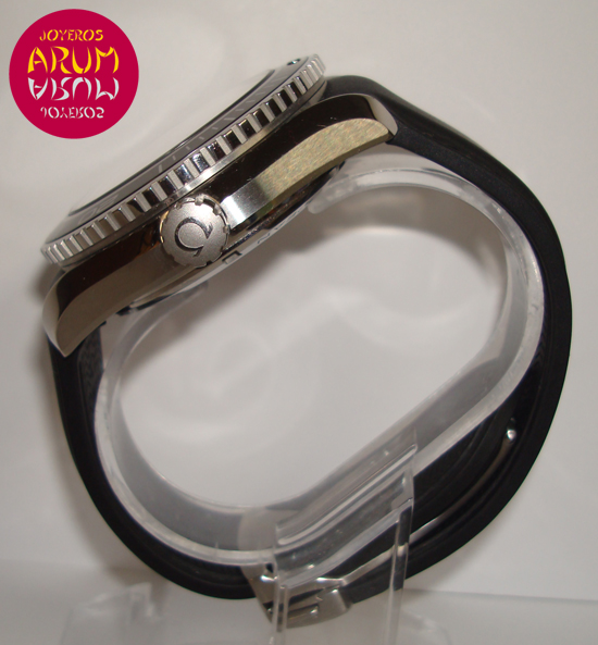 Description :steel, black dial, rotating bezel, sapphire crystal, automatic movement, co-axial escapement, center seconds, date at three, bezel, dial and handles with luminescent indicators, screw crown, auxiliary crown at ten, diameter 45 mm, waterproof 600 meters, rubber strap, folding clasp, year 2012.