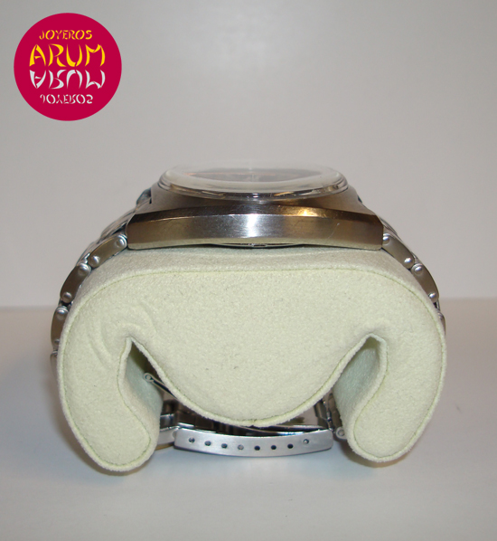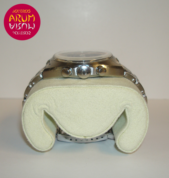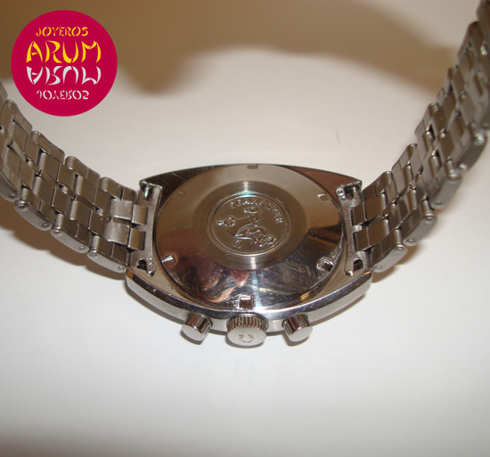 Description :steel, black dial, plastic glass, manual movement, caliber 321, chronograph, three indicators on the dial, seconds, minutes, hours, luminiscent indicators, crown and two buttons at right, 37.5 mm diameter, elastic steel strap, steel folding clasp, year 1966.