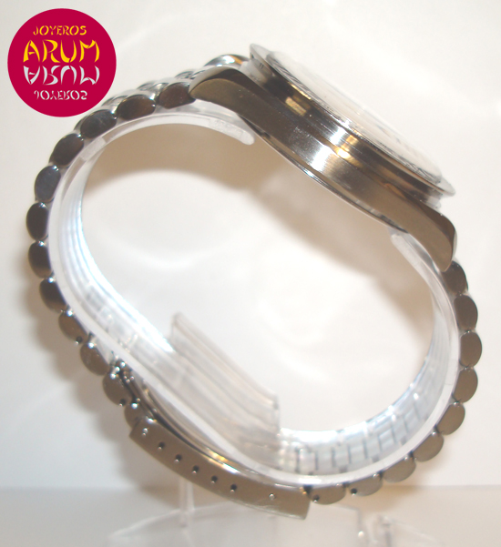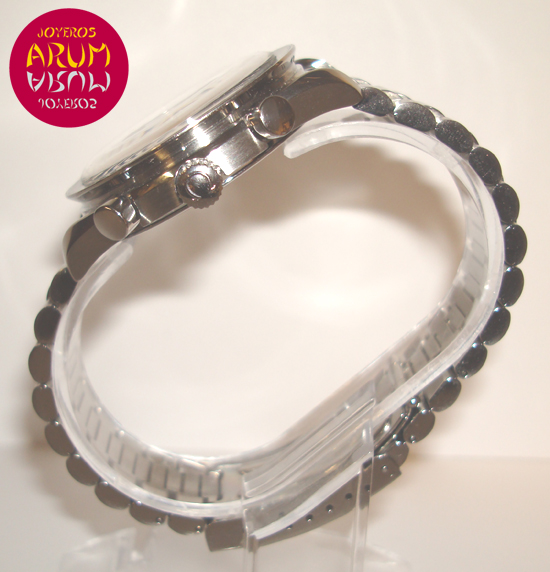 Description :steel, black dial, plexi glass, automatic movement, fixed bezel with tachymeter scale, chronograph, three indicators on the dial, seconds, minutes and hours, handles and luminescent dial, diameter 37 mm, steel strap, folding clasp