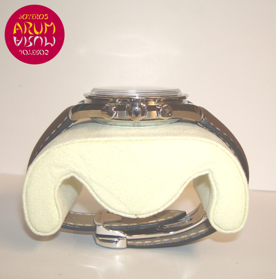 Description :steel, white dial, fixed bezel with tachymeter scale, sapphire crystal, automatic movement, chronograph, three indicators on the dial, seconds, minutes, hours, date at six, luminescent handles, transparent caseback, waterproof 100 meters, diameter 42 mm, brown leather strap, steel folding clasp.