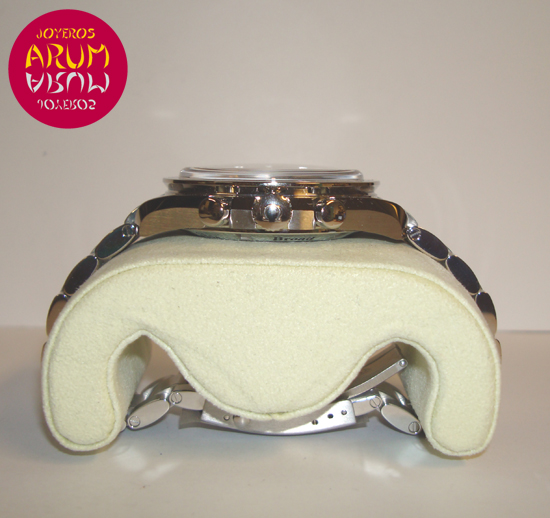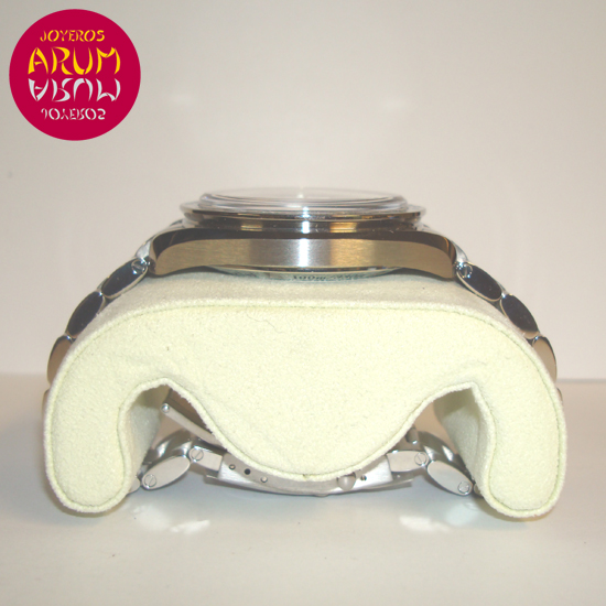 Description :steel, black dial, fixex tachymeter bezel, sapphire crystal, automatic movement, co-axial escape, chronograph, three indicators on the dial, seconds, minutes, hours, date between four and five, handles and luminescent dial, transparent caseback, waterproof to 100 meters, diameter 44 mm, steel strap, steel folding clasp.
