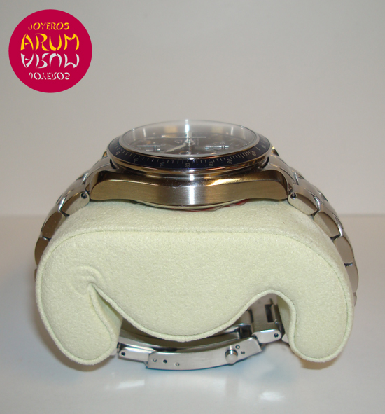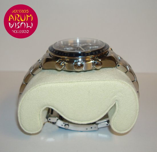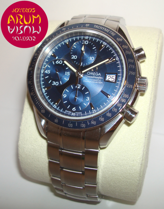 Description :steel, blue dial, blue bezel with tachymeter scale, sapphire crystal, automatic movement, luminescent handles, chronograph, three indicators on the dial, seconds, minutes, hours, date at three, screw crown and two buttons to the right, diameter 38 mm, waterproof 100 meters, steel bracelet, folding clasp, year 2009.