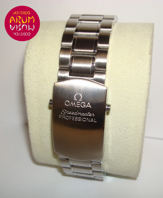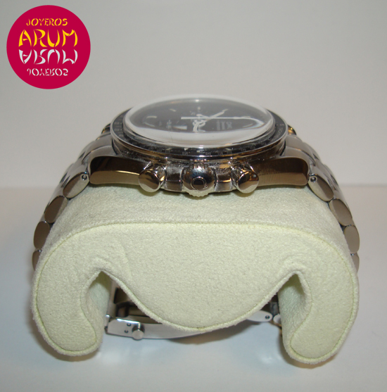 Description :steel, black dial, plexi glass, hand manual movement, tachymeter scale bezel, chronograph, three indicators on the dial, seconds, minutes and hours, luminiscent handles and dial, screw crown and two buttons, 42 mm diameter, 50 meters underwater , caseback engraved with “The first watch worn on the moon”, steel strap, folding clasp.