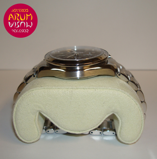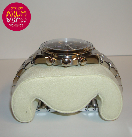 Description :steel, black dial, fixed bezel with tachymeter scale, sapphire crystal, automatic movement, luminescent handles, chronograph, three indicators on the dial, seconds, minutes, hours, date at three, screw crown and two buttons to the right, diameter 38 mm, waterproof 100 meters, steel strap, folding clasp.