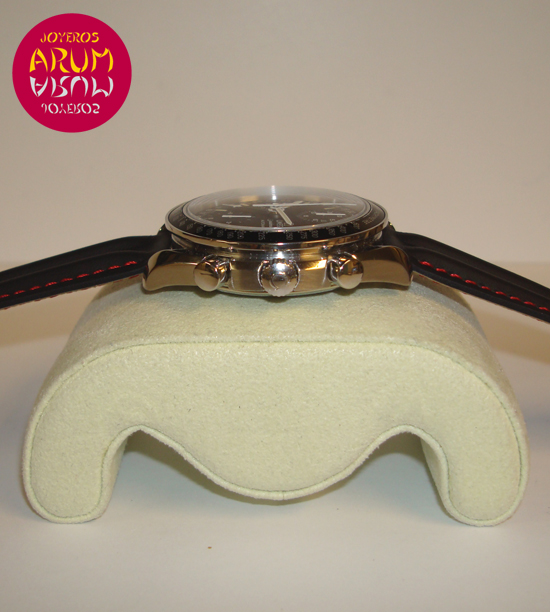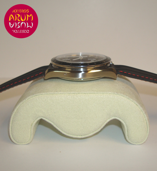 Description :steel, black dial, sapphire crystal, fixed bezel with tachymeter scale, automatic movement, luminescent handles and dial, chronograph, minute indicator, seconds and hours, date display with auxiliary handle, day of the week and month at twelve, diameter 37 mm, waterproof 30 meters, black leather strap, steel buckle closure.