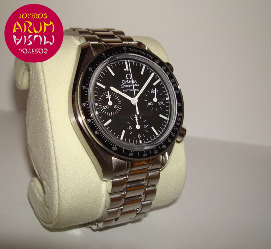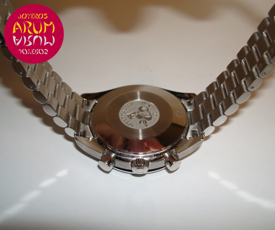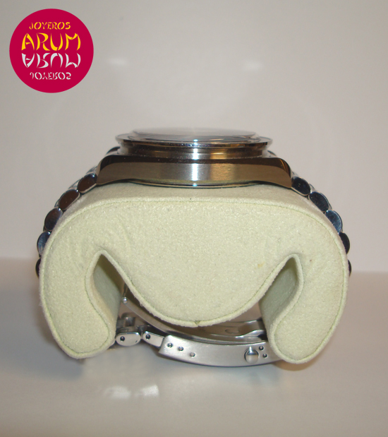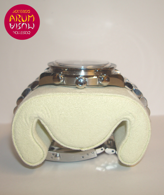 Description :steel, black dial, fixed bezel with tachymeter scale, sapphire crystal, automatic movement, luminescent handles, chronograph, three indicators on the dial, seconds, minutes and hours, screw crown and two buttons at right, diameter 38 mm, waterproof 100 meters, steel bracelet, folding clasp, year 2010.