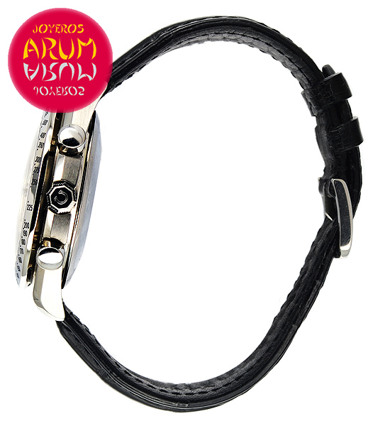 Other specifications :triple calendar, day and month at twelve, date indicated with central handle, chronograph, tachymetre, luminiscence handles, year 1996. With second steel strap.