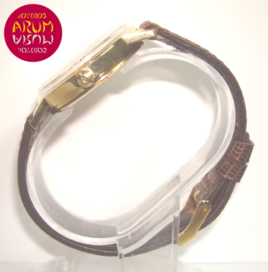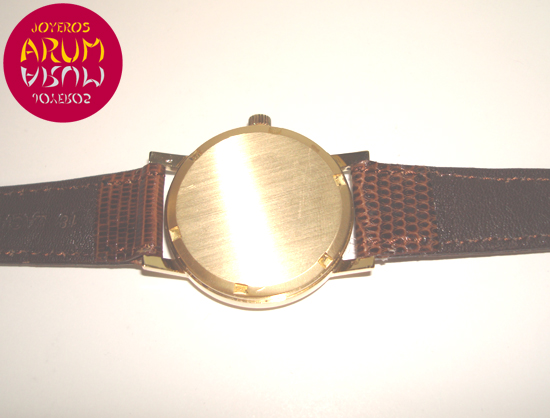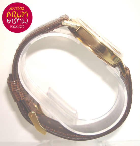 Description :yellow gold, yellow dial, smooth bezel, plastic glass, automatic movement, date at three, central seconds, diameter 34 mm, brown leather strap, buckle closure.
