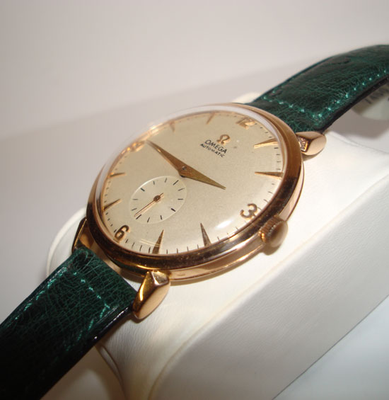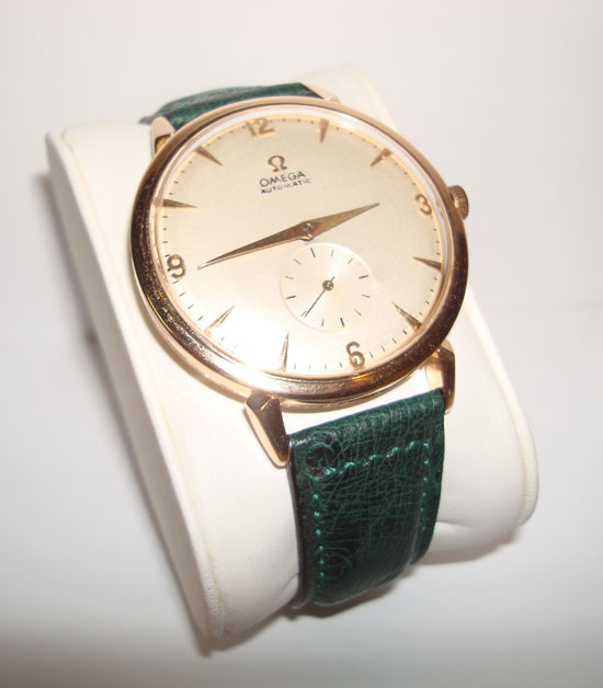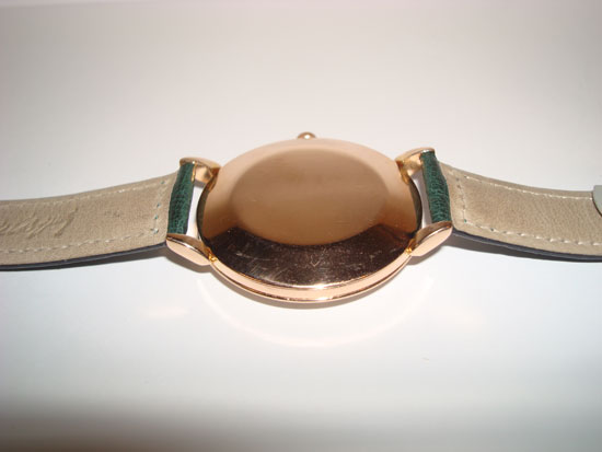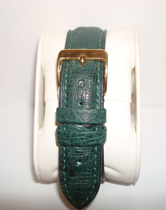 Description :rose gold, automatic, plastic crystal, small second, diameter 37 mm, dark green leather strap, buckle closure.