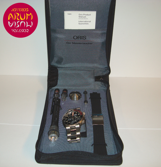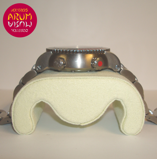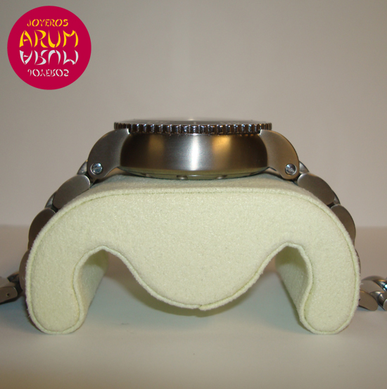 Description :titanium, black dial, rotating bezel, sapphire crystal, automatic movement, display of hours between three and five, minute indicator with central handle, small seconds between nine and eleven, date at six, handles and luminescent dial, two crowns at right, water resistant 1000 meters, diameter 44 mm, titanium strap, folding clasp, year 2009. Includes a second strap.