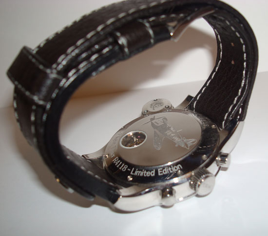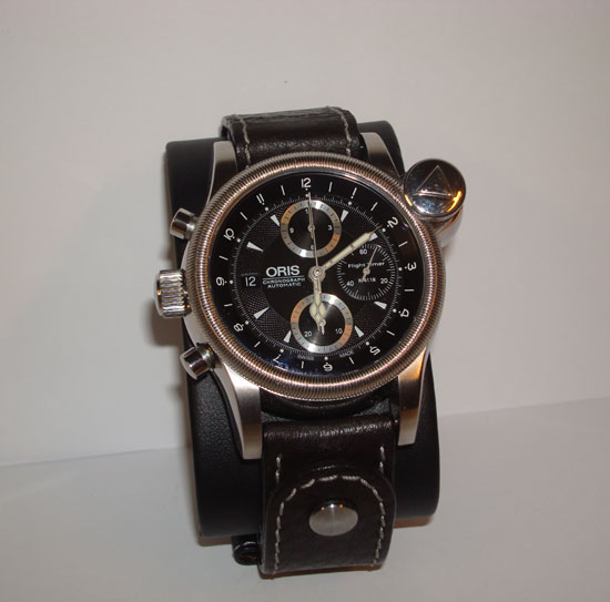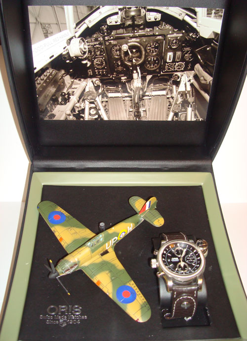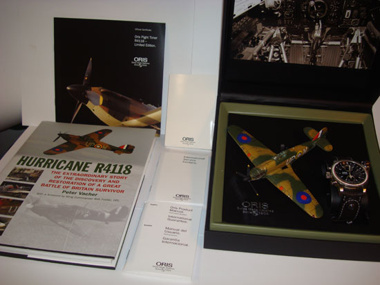 Description :includes replica airplane “Hurricane R4118” and book “Hurricane R4118” written by Peter Vacher. As a tribute to the legendary Hurricane R4118 aircraft, Oris sold this watch in a series limited to 4118 units (This watch is number 0183/4118). As in the old watches aircraft is equipped with a corona that drives a vertical synchronizing an internal bevel second time zone. The pushers and crown are placed on the left, making it even more exceptional. Other features include: Automatic Machinery chronograph function; Sphere “guilloché”; Box (44mm) steel 316L with multipieza interior bezel for second time zone, Water resistant 50 meters. Date to nine. Sapphire crystal bracelet and leather inspired by the uniform of the pilots.