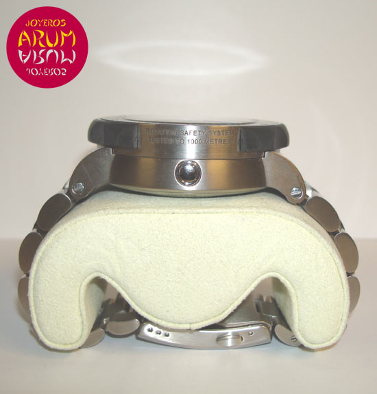 Description :titanium, ceramic rotating bezel, black dial, sapphire crystal, chronograph, three indicators on the dial, seconds, minutes, hours, date at six, handles with luminescent indicators, rotating security system to ensure the waterproof, water resistant 1000 meters, helium valve, crown and two buttons at right, 51 mm diameter, titanium strap, folding clasp, year 2012.