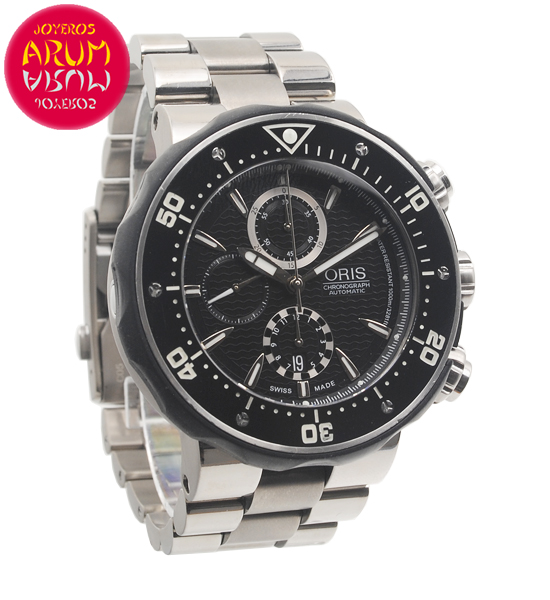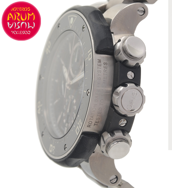 Other specifications :calibre Oris 674, power reserve 48 hours, helium valve, chronograph, date at six, small seconds at nine, luminous superluminova marks, screw crown. Year 2010.