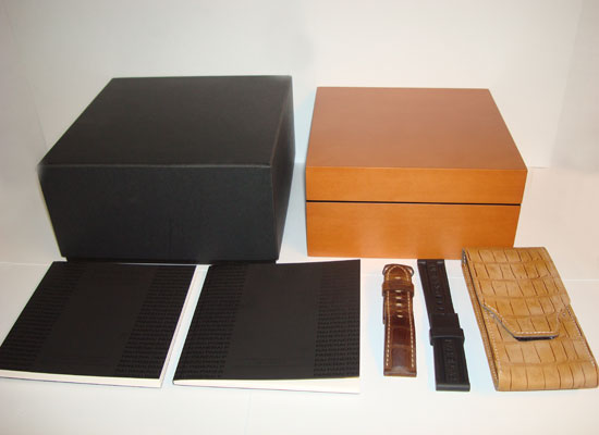 Description :available with 4 straps, two in leather, one black and one brown, rubber strap, and a special “Strap Culture” . Steel case, sapphire crystal, small seconds, date, luminescence, diameter 44 mm, protected crown and closing lever, transparent back cover, P9000 caliber.