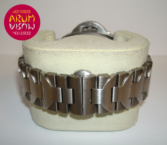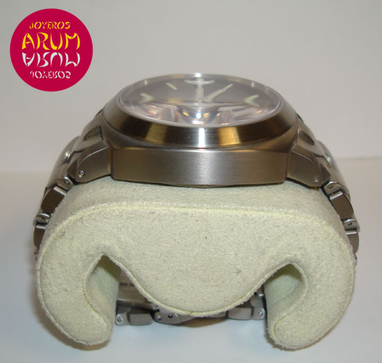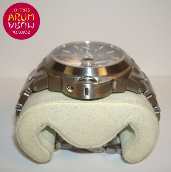 Description :titanium, black dial, sapphire crystal anti-reflective, automatic movement, small seconds at nine, date with magnifier at three, handles and luminescent dial, OP III caliber, power reserve of 42 hours, crown with protective and lock , waterproof 300 meters, diameter 44 mm, steel and titanium strap, steel hidden clasp, year 2006, available with 3 straps.