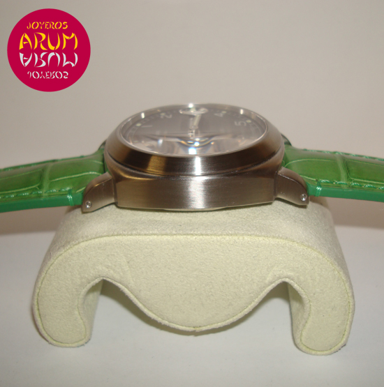 Description :steel, anthracite dial, sapphire crystal, automatic movement, date at three with a magnifying glass, handles and luminescent numbers, crown with protective, water resistant 300 meters, diameter 44 mm, green leather strap, close steel buckle, year 2002.