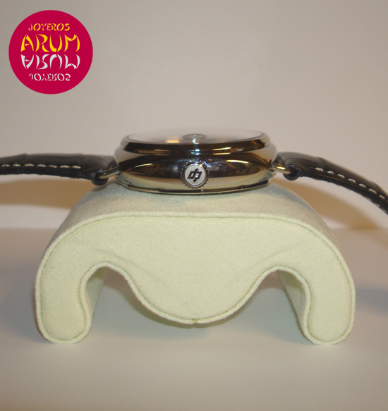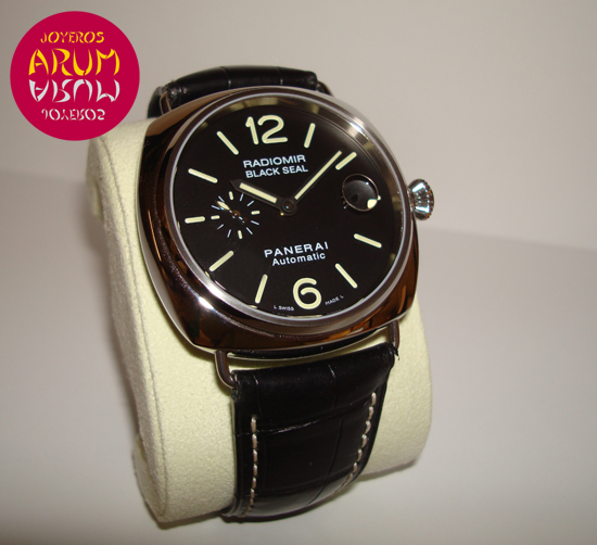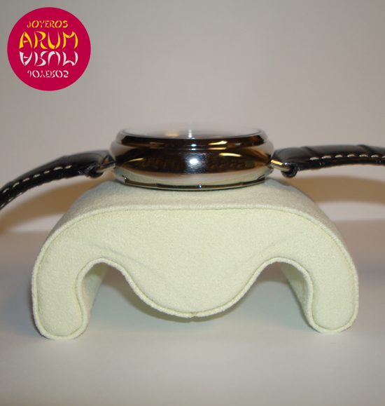 Description :steel, black dial, smooth bezel, sapphire crystal, automatic movement, date with magnifying glass at three, small seconds at nine, handles and luminescent dial, screw crown, diameter 45 mm, black leather strap, steel folding clasp.