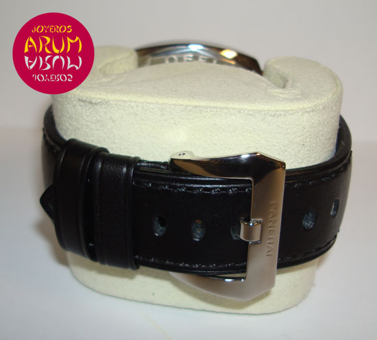 Description :steel, black dial, sapphire crystal with anti-reflective coating, manual hand movement, luminiscence dial and handles, small seconds at nine, screw crown, diameter 45 mm, power reserve of 56 hours, transparent caseback, water resistant 100 meters, black leather strap, steel buckle closure, year 2009.