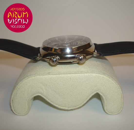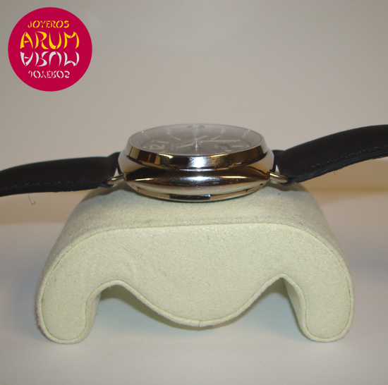 Description :steel, black dial, sapphire crystal, automatic movement, adjustable inner bezel, GMT function (second time zone), alarm, date with magnifier at three, handles and luminescent dial, two crowns at the right, diameter 42 mm, waterproof 30 meters, transparent back, black leather strap, includes a second rubber strap.